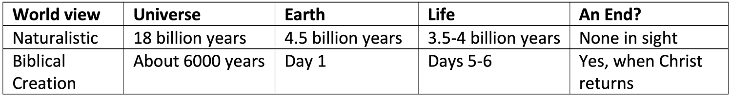The clash may seem to be a religion vs. science issue but it is not. The fundamentals of both world views are not particularly complex. Neither can be proven, but they are used to interpret what we see and experience. World views are like that: they are systems of faith-based beliefs by which people interpret the world around them. This statement may be bothersome because most people are taught that the naturalistic world view is scientific with confirmed evidence. That is not quite the case. Who was there (18 billion years ago for the universe and about 4-5 billion years for the earth)? Who saw life first produced from some sort of extraordinary ‘soup’? Where are the links to get us from ‘soup,’ to cells, to fish, to reptiles, to apes, and finally to us? Who saw them? The conjecture of the naturalistic or evolutionary view is believed as a conclusion: we came from nothing (ultimately) by accident, and it took a long time. In contrast, if the biblical record from God is believed, then we were created; all things were created, and it happened a few thousand years ago. Either world view can be believed. Once the choice is made, the things that are seen are interpreted accordingly. The short table below illustrates the basic differences in the world views with respect to time elapsed.