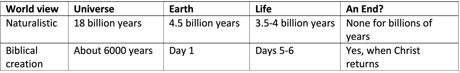 Questions about the age of the earth are frequently asked. The answer, as said in previous lessons, is entirely different between the naturalistic and biblical views. Here is the same table from Unit 3 Lesson 1 that summarizes the differences.