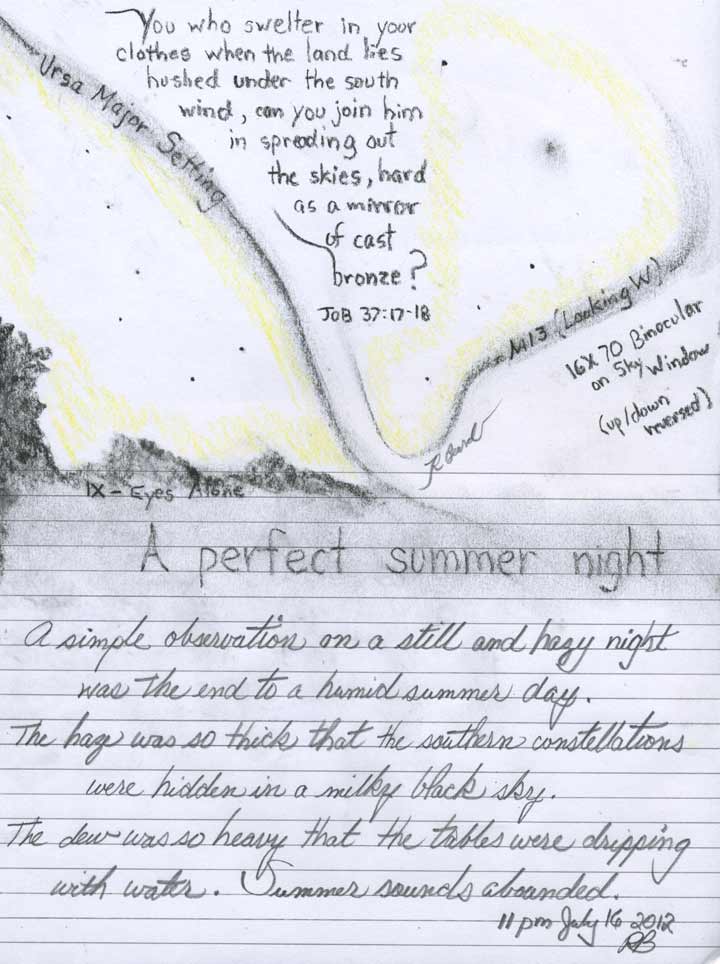 However, it had been a wonderful day with Linda. We were both too tired to put up a scope. She retired to watch a favorite video but I headed outside to enjoy the sky for a few minutes. It was a joyful time as I recalled favorite stars, talked to the Lord about the wonder of the heavens but also his mention of these kinds of nights in the book of Job. I only did a quick sketch of Ursa Major that was settling into the trees and M13 almost directly overhead. The night closed with a request: “Can you make me some popcorn?” Who can refuse the request of a lovely wife? So I wrapped up the observing time.