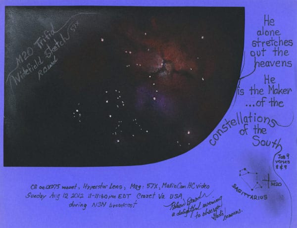 The sketch was developed from a wide field view of the Trifid in a beautiful star field, but there was not enough time to place all the stars. I tried to identify enough of them to set the nebula in an identifiable background. The color is viewable because I put an astro video camera in the place of an eyepiece, and the chip on the video camera permits me to see the gentle colors–especially the soft transition from red to blue that makes the object unique (along with the dark lane paths through the illuminated gases).
