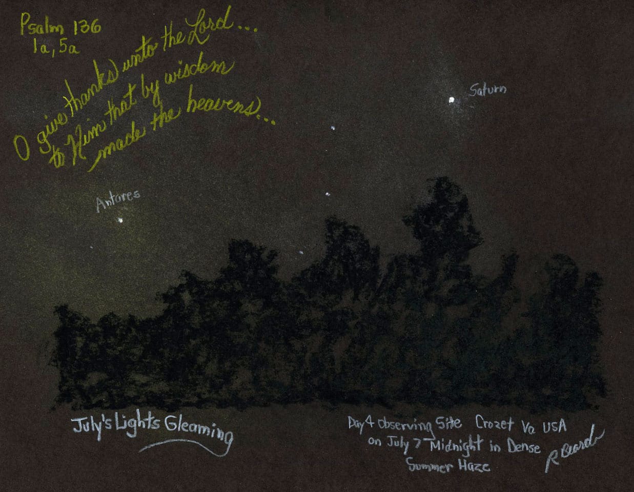 On this particular night in July as western Scorpius and Saturn appeared, I relaxed in a chair after the sketch to just watch the tree line. Little fireflies lighted the black forest. The deer had marched through earlier. The earth is His also–that special place designed to be inhabited by the crown of His creation: mankind. So we have a chance, just a short one, to reach out and ask Him to draw close. His invitation is readily seen in the heavens or the earth. One choice is to deny He had or has a hand in any of it. Nothing is more foolish. But He is patient and merciful, waiting for the hungry and curious hearts who want to know Him.