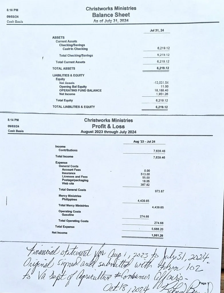 CHRISTWORKS MINISTRIES tax or government-related reporting is limited to three submissions. Two of them are the Commonwealth of Virginia (the Virginia Department of Agriculture and Consumer Services, and the State Corporation Commission). The IRS submission is an e-postcard since our contribution level is so low. We generally change or update the information on this site to show the last fiscal year financial summary (August 1 of a given year and end July 31 of the following year). Board members discuss the reporting after the end of fiscal year along with a general report of activities and projections of expenses for the near future. This page only has the financial summary. General and projected activity is in the <Ministry Reports> submenu.