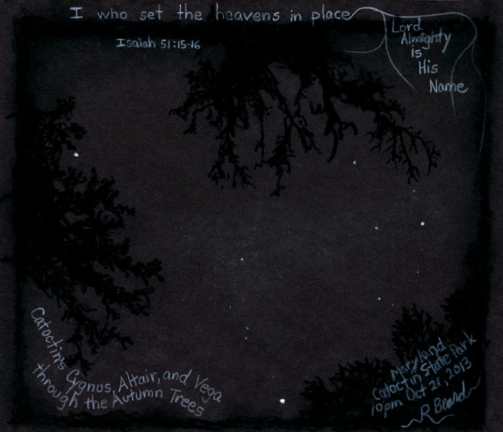 Looking Straight Up. Have you ever gone camping or taken a walk at night and looked straight up through the trees? You can see the stars peaking through the branches. The sky seems lighter than the trees because star light really does provide a little light (along with a little light pollution). On this particular night in Western Maryland on Catoctin Mountain, I could see the Northern Cross (Cygnus constellation) and two major stars (Altair and Vega) through the trees.