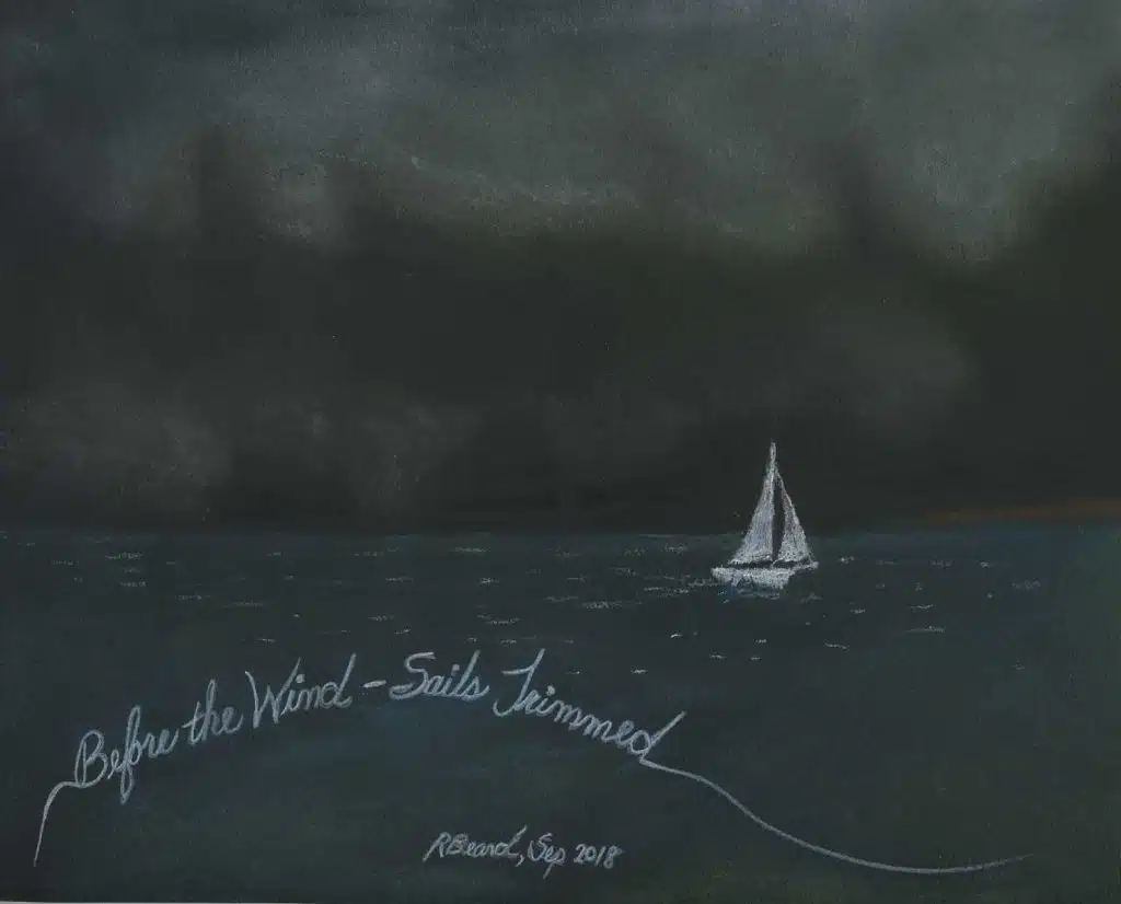 The picture and my sketch show a storm in the background of the vessel that was before the wind. A small storm or squall might seem like danger, but it is also full of what the sailing craft needs most to travel in a desired direction. He spoke to us in the scene to be responsive to Him. There was good reason, as we found out, for the exhortation when it came. We recommend that you, if you love Him, do likewise: want His guidance and obey it. It is the best place to be.