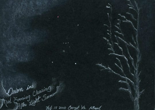 Technical Note: The drawing was an eyes-only view in the early evening. Background light from a house lighted the tree with snow. The clouds reflected light from a nearby town. The constellation’s major four stars (Betelgeuse is the reddish star near the top) and the belt of Orion (the center 3 stars) could be seen through light haze. The Orion Nebula was a “smudge” and a couple other star groups appeared as smudges. The sketch used white pencil and pastel on black paper. Contrast was raised for the web view.