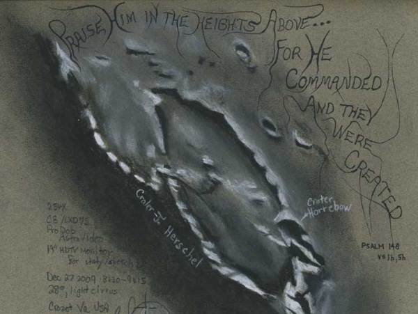 It is a privilege to observe the moon. A planetary body so close to earth and with an abundance of interesting features provides wonderful opportunities for study. God mentions the moon many times in the Bible. His ordered precision in its size, mass, position and motion are fascinating with respect to light at night, marking time, ocean tides, and eclipses. This sketch was done on one of those clear cold nights when I was appreciating some of these lunar attributes. I picked an area near the terminator, where light and shadow played over the surface of the Herschel crater, which became the center of the study and sketch. During this study I used an 8 inch Schmidt Cassegrain telescope with an astro-video camera set with an electronic shutter speed. The video image was relayed to a high resolution monitor at the sketch station.