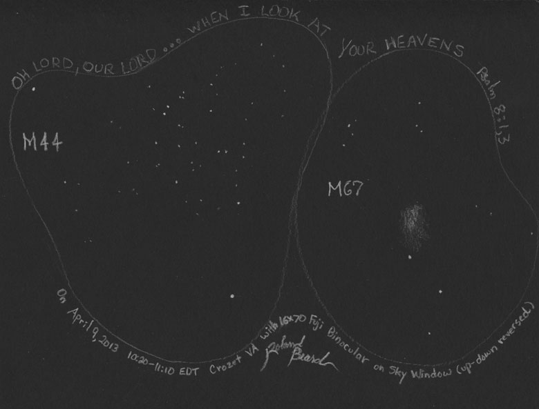 The sketch below took about 40 minutes. It was done with a 16 power binocular on two common and bright objects in the constellation called Cancer. In April they are high in Western sky. If the sky is reasonably dark, M44 is like a white puff and pretty large. A binocular permits a person to pick out many of the stars. M67 is smaller; individual stars cannot be seen at low power but the white puff can still be located easily.