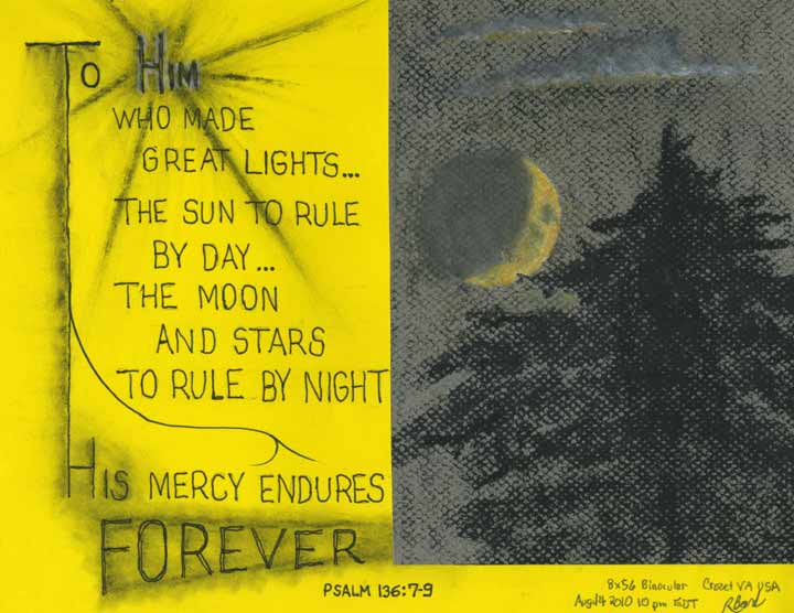 Verses 7-9 are summarized to the left of the sketch. I think of God’s mercy when I see the summer haze on a calm evening. It turns the moon orange but it is more. The moisture comes from undulating waves of low and high pressure that cross the globe. In my locale they are responsible to the moisture that keeps plants alive and provides water for our thirst. The design of the water cycle, the atmosphere, and the earth are so precise that temperatures stay in a very small range; water is abundant; and we can live comfortably on a completely unique planet, whose conditions are statistically impossible to self-evolve. Rather, God’s mercy made the planet intentionally habitable–ready for a people, for every person, to choose Him or deny Him. And he waits with unmeasurable mercy to permit each one to make that choice.