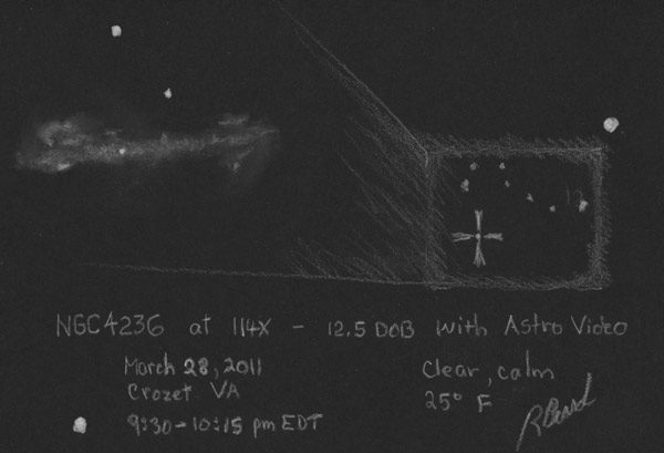 With this in view, the first sketch below shows NGC 4236. The Dobsonian provided enough light gathering, when coupled with the astro video camera, to show some shape–namely the ‘bar” that marks the center area and a little of the “wings” of the spirals at the ends of the bar.