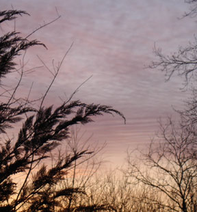 I ran to get a camera since I knew that the soft colors would change rapidly. By this time the moon was almost fully obscured by clouds, but the morning colors on the clouds were very nice.
