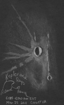 Kepler is a popular sketching target for those who study the moon’s surface but I had never had a chance to sketch it. The deteriorating sky conditions along with the use of astro video on the telescope highlighted the changes the surface but hid the finer detail that would normally be seen. It was a short but enjoyable 15 minutes. At this point the observing periods would seem to have been concluded but I stepped outside to face the dawn light to find a gentle picture of ribbons of cirro-stratus that were lighted by the rising sun. It reminded me of a favorite scripture:
