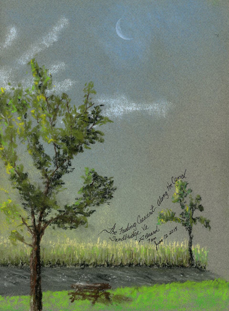 The morning was quiet without a breath of wind or the sounds of people. I only walked a few yards to set in a chair and watch the fading crescent moon as the sun rose. The nearby canal was glass calm and the tall marsh rushes on the far side had creamy tan tassles in the morning sunlight. I recorded the scene as best I could, deliberately exaggerating the size of the crescent moon to better capture its contrast to the sky. The campground was coming alive by the time I was done.