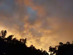 Yet another day near sunset showed bright skies and flaming colors in the clouds, but the details of the forest could not be seen.