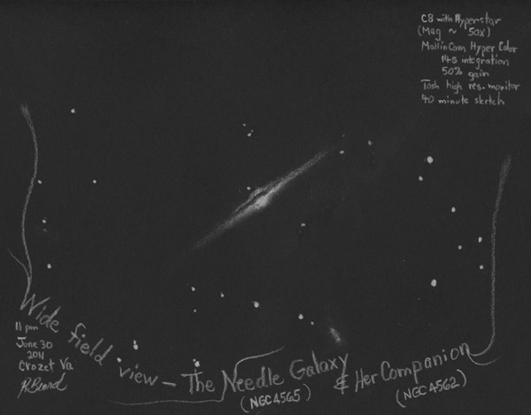 This is a quick sketch of an edge-on galaxy that is popular with observers. An edge-on galaxy by itself is like an invitation to look: to see past or more than the edge-on view will permit.