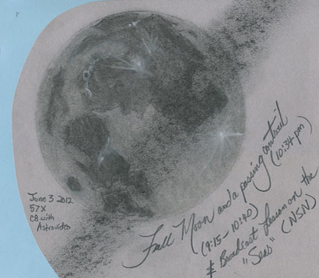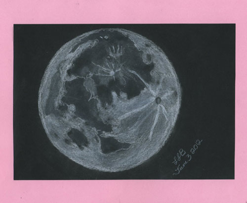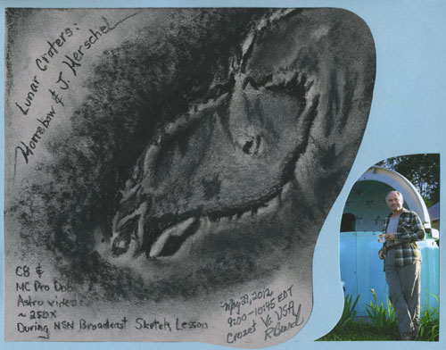 Linda and I both worked at the same sketch station in the house we did a few nights before. Like the night with Herschel, we had 10-15 folks with us on NSN. Several followed the process and sketched or just enjoyed the view. Linda’s sketch (to the left) was the first time she had ever tried sketching the whole face of the moon.
