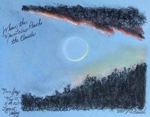 Last evening we observed, as we do often if the sky conditions are good. I did a quick sketch of the 3-day old waxing crescent moon that was sandwiched between a line of grey clouds and the rising mountains on the West side of the Tygart Valley. The moon size is exaggerated, but the scene is otherwise as I observed it. The chances to observe did not end with going to bed, however. I woke at 3:30 am to find the skies pristine-clear. The time meant we could see the Milky Way stretched from southeast to overhead, from Sagittarius to Cassiopeia — the same sky we would see in early evening in late Summer. Why the same picture? Because the Wonderful Creator placed the heavens on the fourth day of the creation week with a precision that permits us to periodically observe most of the night skies every year. We were a sight with robes and jackets and quickly donned shoes over bare feet, but the fifteen minutes of observation were well worth it. Under these conditions, the Milky Way appears as a line of whitish clouds and the prominent stars are so numerous it is easy to get lost.
