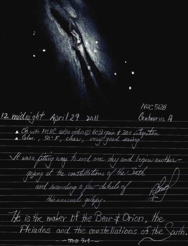 The first object is called Centaurus A. It is a most unusual galaxy from our vantage point. I made the sketch in a notebook (black pencil on white paper) but inverted the image and observing sheet that you see below.