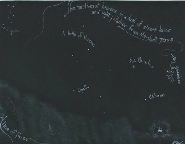 The sketch below could have been done in a hundred places. I just happened to be near Marshall, Texas in a campground on what could have been a pristine observing night. However, the light from the town and the lights in the campground obliterated the view of the heavens. I could count less than 30 stars to the Northeast, but as I looked at the sky and the conditions I felt compelled to record the scene. Later, scriptures came to mind that made the observing session make sense. Here is the observing sheet before I continue the story:
