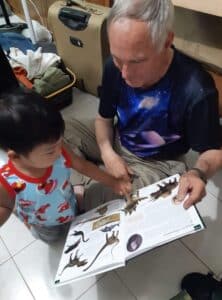 Our friend, Roselle, brought her little boy to see us. We showed him his ‘baby’ pictures from 3 years ago. It was not long before I was on the floor with Harris as we paged through a dinosaur book. In understandable English, told me the names of over 10 big dinosaurs, then sang me his dinosaur song. We had many visits from him and his older sister. When Harris came to visit, I greeted him like other little ones about his size. I would call his name with a smile, gently pick him up, toss him in the air, catch him, and set him down. He and his sister exhibit the confidence that comes from loving parents. Raymond and Roselle’s children visited our quarters a lot.