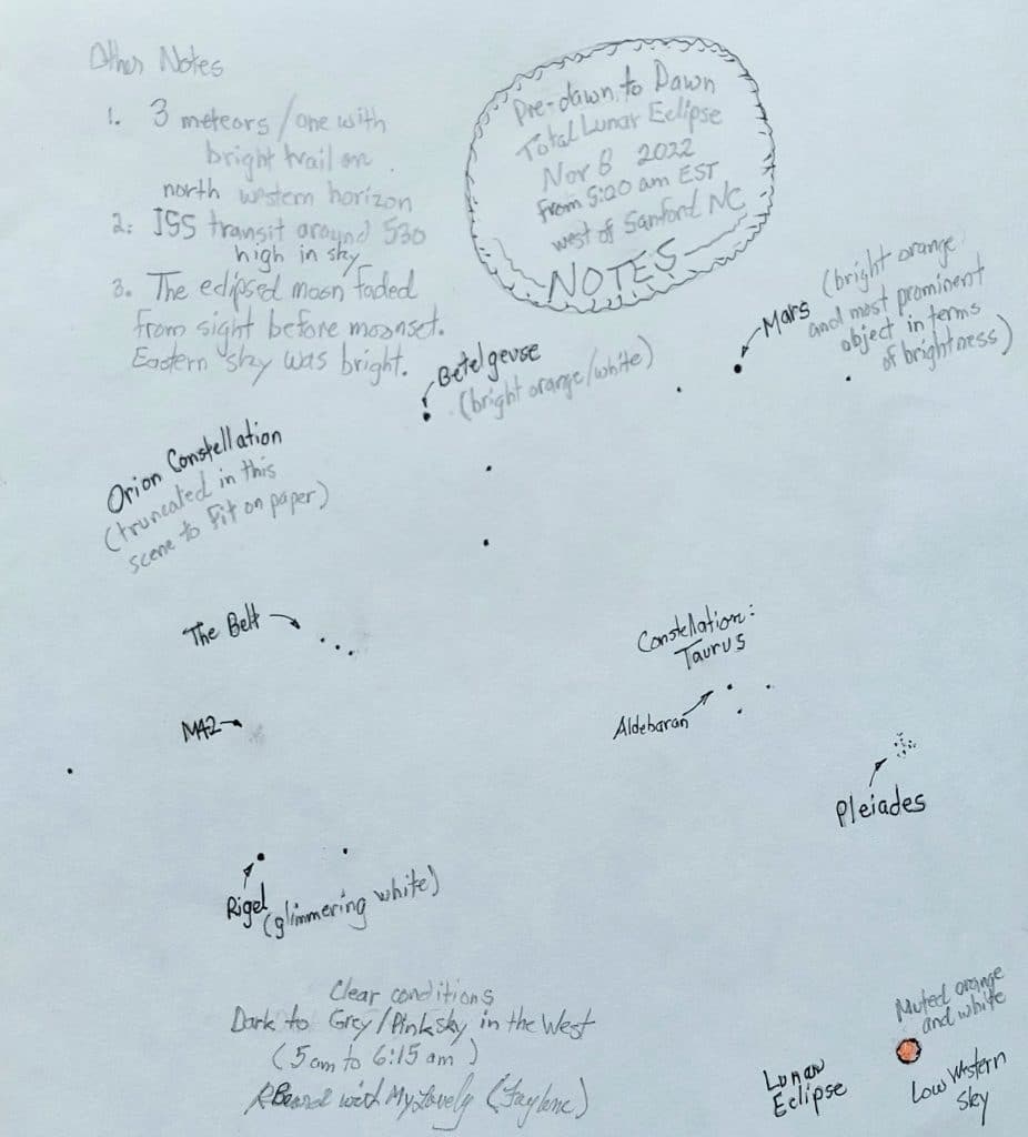The neat thing about this eclipse was the natural darkening of the pre-dawn sky that occurs. So I constructed a note and observing sheet with the view of Orion, Taurus, Pleiades, and finally the moon in the lower right corner. While we observed and sketched, the dawn light began changing the sky, so we saw the stars disappear, and the lunar eclipse lose its contrast as the moon met the tree line.