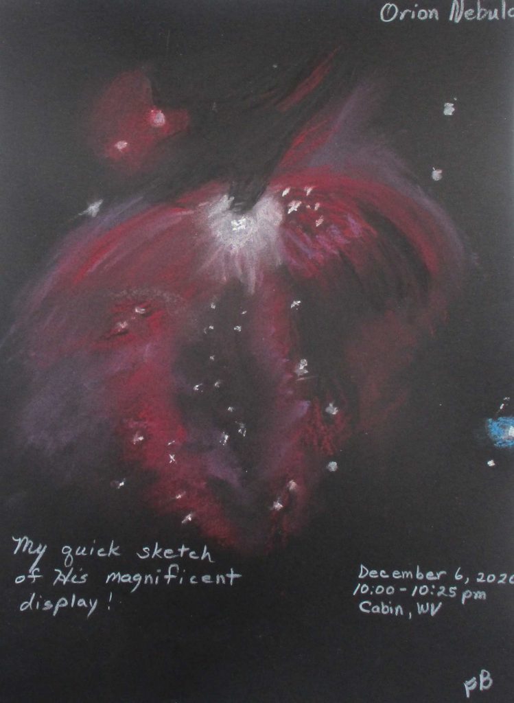 Faylene’s sketch is first. She had not done a pastel sketch of any object before doing the Orion Nebula, and she is new at sketching. She did an excellent job for her limited experience. You will notice her colors, the shapes of the wings on either side of the central area of the Great Orion Nebula, which have a characteristic bright central area due to stars lighting up thin stellar clouds. She stopped after a half hour and decided to watch me.
