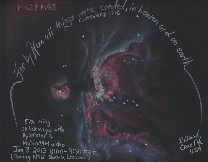 However striking M42 is, its purpose is the same: a signpost that points to the Author of the heavens. Posting this blog note and the sketch below is part of our passion to declare His handiwork. This passion has grown since we began observing and sketching about 6 years ago. We have taken the message of creation and the Gospel, coupled with teaching practical observing skills, to other countries and places. On occasion (and this evening was one of them), we broadcast the sketch process on Night Skies Network while we are observing.