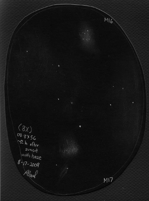 So before you begin, here is a simple sketch of a grouping of stars near the Eagle and Swan Nebulae (M16 and M17), which can be seen in the late summer. This sketch was done by using a 8 power binocular. After looking at the sketch, we will provide some information about a couple things you can get that will be real handy for observing the heavens.