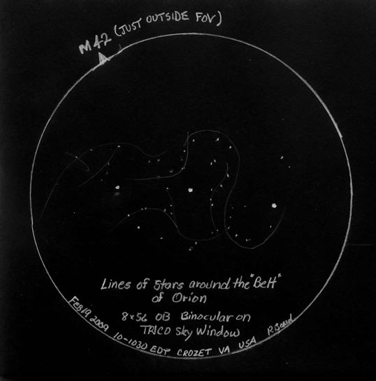 The Orion constellation is high in the Winter months for us in the Northern Hemisphere. Even without a telescope the night sky shows the Seven Sisters (the Pleiades) setting in the Western sky with Orion much higher and following it. Both are mentioned in Scripture. It seems that the Lord uses them as particular signposts of the work of His hands. A binocular view of the central three stars (called the “Belt of Orion”) shows a beautiful open cluster of stars. The sketch below shows the area with an inexpensive 8×56 binocular. Take a peek at the sketch and, if you have a set of binoculars, see if you can find the meandering lines of stars that make a giant “S” around the Belt. In case you are comparing to the sketch, note that up/down is reversed on the sketch because I was using a reflecting mirror.