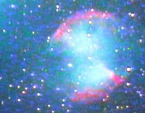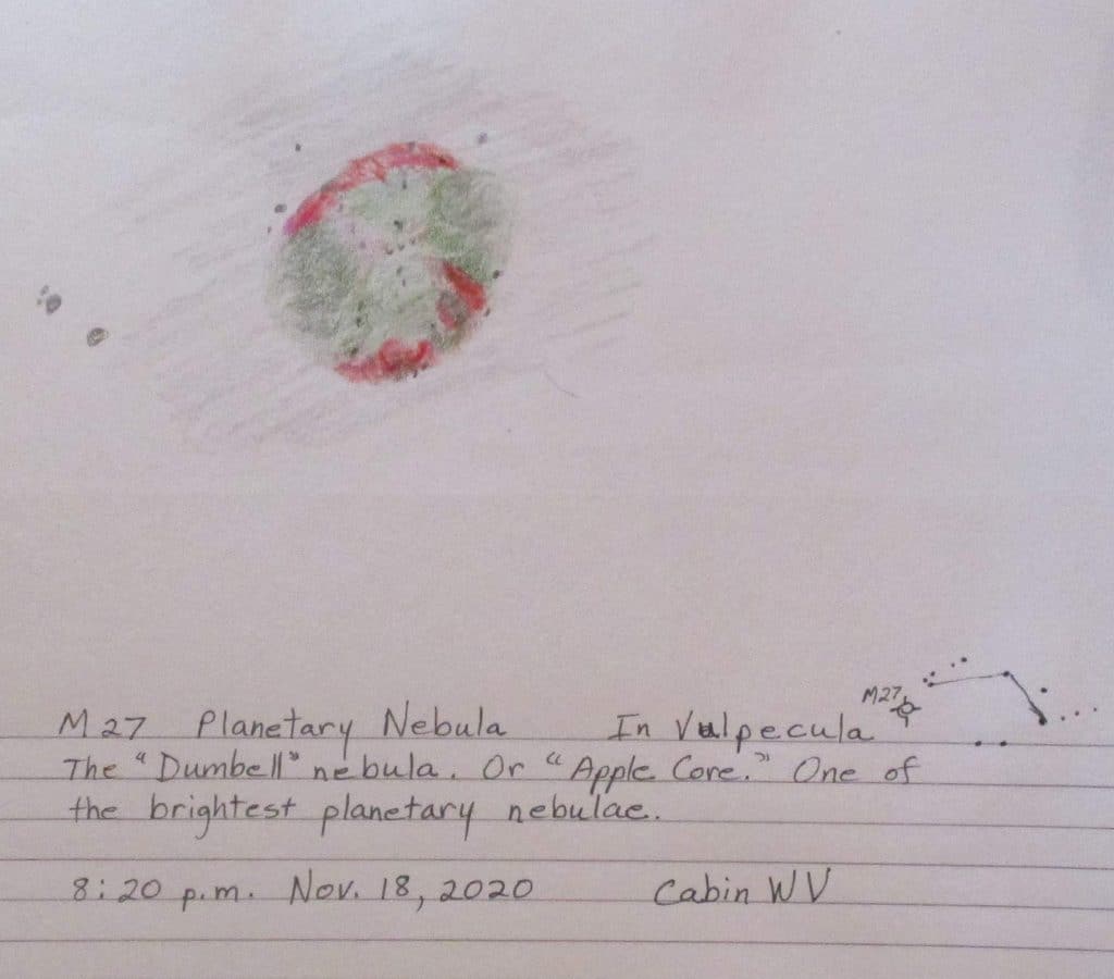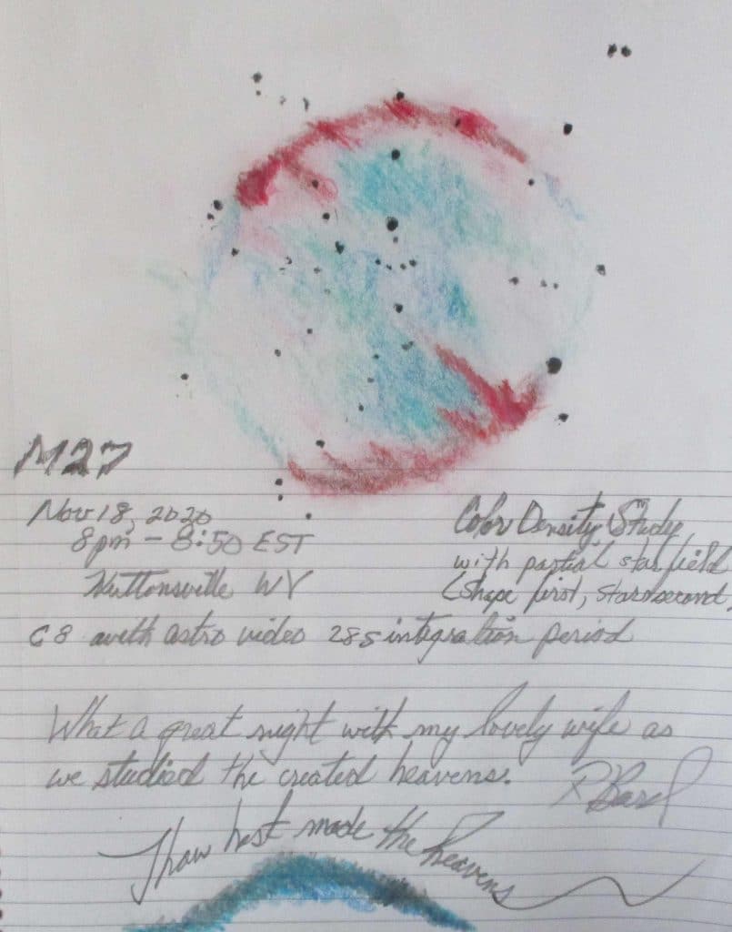 Introducing my Lovely (Faylene) to planetary nebula began with the Ring Nebula (M57) but I was waiting for a clear night to see the Dumbbell Nebula (M27) because her favorite color is blue. The green hue of the center of the Ring is certainly beautiful, but the blue-green and red of M27 is even more captivating.