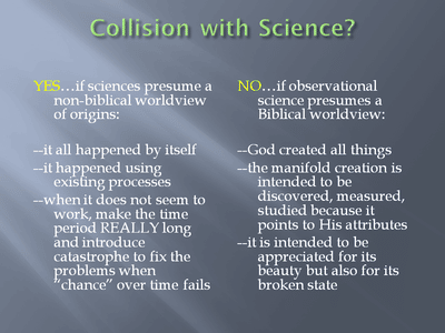 So does this cause a collision with science. Yes and no. The answer is “yes” if science is presumes a non-biblical self-generating universe. The tenants for this evolutionary position are listed on the left, but you must realize that this type of hyper-extrapolation is not in the realm of science, it is in the realm of history. No one was present to observe and experiment and measure at that time. It is the realm of history. In the realm of history, the biblical view is the foundation assumption for the believing scientist or engineer or any other person: that God created all things, and the created universe was meant to be discovered, measured and studied. The believing scientist or student, as a result, can become passionate to discover the created universe because it points to God. Some of its characteristics also point to its broken state due to sin. Stars are inherently unstable. Comets are short-lived and dying. We see evidence, even among the beauty of the heavens, of problems.