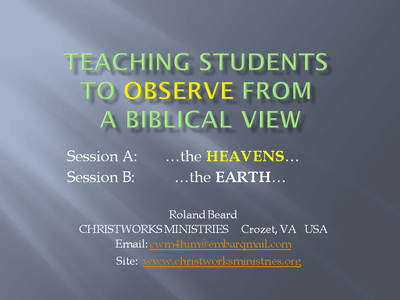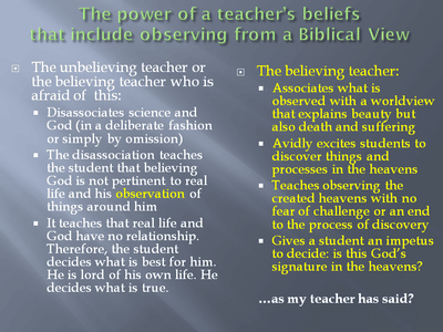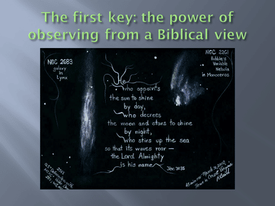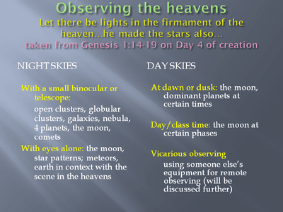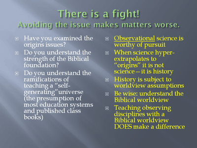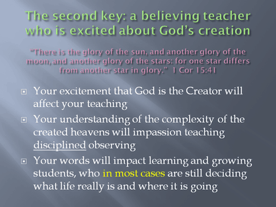 For the teacher, there is a fight that is happening. It is better to be aware of it than ignore it. There is increasing denial that God has anything to do with the universe, even in the face of increasing evidence of unique characteristics of planets and other objects. We usually give this presentation to Christians, but many have not studied the scriptures for themselves so they are unfamiliar with origins from a Biblical point of view. You need to examine them if you have not so that you understand the strength of the biblical foundation and the ramifications of an evolutionary self-generating universe that is taught in most classrooms. The good news is that observational or operational science is strengthened with the biblical framework — not weakened. God wants us to discover, as said before. And we want to teach disciplined observing so the process of discovery is exciting for the observer. The Biblical worldview does make a difference.