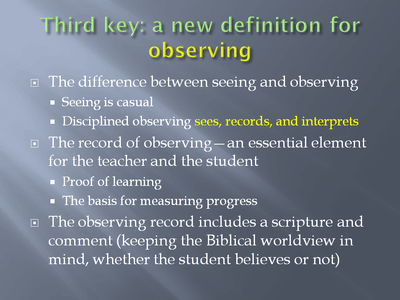 Do you remember our definition of observing at the beginning of the presentation? It is the third key for disciplined observing from a Biblical view. We teach observing as the process of seeing, recording, and interpreting what is seen and recorded. The recording is a simple sketch on an observing sheet. The record becomes proof of learning and a basis for measuring student progress in the discipline of observing. The observing sheet includes a scripture and a comment – even if the student is not a Christian. Being a Christian is a matter of faith and decision. The student may not be there yet. But he can appreciate the worldview, cite a scripture, and stand back long enough to comment on what has been observed.