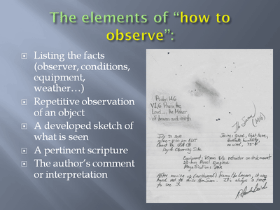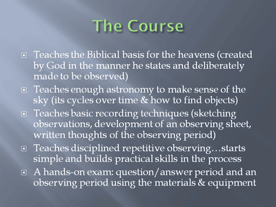 Unlike many courses, this one is practical as well as spiritual. The Biblical basis is throughout the lessons. We teach enough astronomy to make sense of the sky. The remainder of the course is practical: teaching observing skills and equipment skills. In the end, we teach disciplined observing. When we provide the training, we have an exam with both a questions/answers with the student and an observing period using the equipment skills that he has developed.