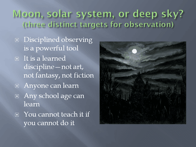 Once the basic disciplines of observing are learned, the choices of targets are manifold. A couple of cautions: it is a learned disciplined but it is not meant to be art or fantasy or fiction. There is a place for these, but the function of accurately observing what is seen is truly a disciplined record of what is seen. So the teacher or parent is always pursuing an excellence to record what is accurate and true, so that the complexity and beauty of God’s creation begins to register with the observer. In the process, what is produced, after some practice, can be beautiful. Consider the scene on the right. It is a painting of a picture but adjusted by memory because the photograph was not exposed enough when I took it. The full moon was punching through layers of stratus, and the light was causing the foreground trees to be a silhouette. It may look complicated, but anyone can begin to learn to observe, produce a basic sketch, and develop the discipline so the results are amazing. A teacher or parent will be hard pressed to teach this if they cannot do it themselves, but we have taught this to 5 year olds to grandfathers and grandmothers. It can be done. It is the choice of targets that get complicated because you can choose the moon in its phases, prominent planets in the solar system, or deep sky objects with a simple binocular or a small telescope to help.