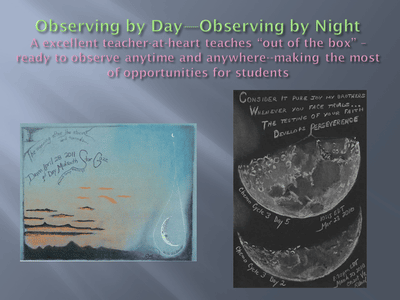 When a student becomes accustomed to observing, a lesson or story often emerges from the context of the observation period. Here are two examples. The left hand observing sheet was developed during the dawn after tornadoes ripped through Alabama–killing more than 150 people. It was a poignant morning that was peaceful and quiet but less than 100 miles away small towns had been destroyed. I captured the dawn light on the clouds that were still breaking up and then captured the crescent moon with a binocular. The observing sketch was coupled to a story that was posted on our ministry site. The picture on the right recalls the change in the moon between two points of my wife’s chemotherapy treatment of a serious cancer. I kept thinking of the scripture about perseverance as we worked through the treatments. I won’t forget the observations. In other words, observations can cover subjects that are often difficult or teach hard lessons or show uncomfortable truths.