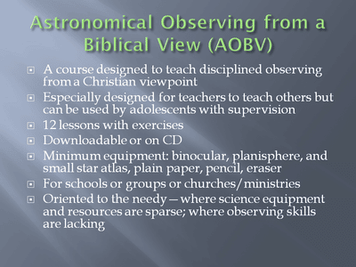 As a result of the learning gaps we observed in our travels, we developed AOBV to teach observing the heavens from a Biblical view. It is especially for teachers or leaders or parents, but it can easily be adapted for a variety of situations. Like many courses, it is divided into lessons with practical exercises. By registering for the course at the www.christworksministries site (the green folder on the home page gets you to the first description) you can download the course for your organization or school. It is free. The copyright, as we explain, is to maintain its non-commercial use and protect its integrity. There is some minimum equipment needed for the course. In needy places where we have established a relationship, we provide some of the equipment and training as the Lord provides the resources to do it. For homeschooling parents or small schools or ministries, the equipment can be purchased from a variety of companies at relatively low cost.