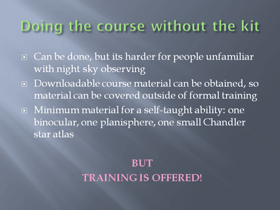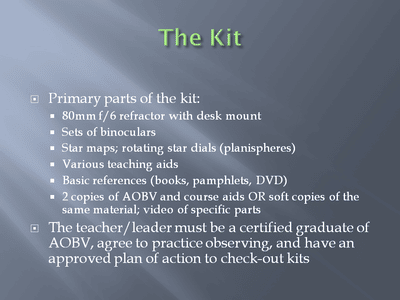 We do not recommend kits like be given to someone without training because they may not treat equipment carefully. For developing areas where the equipment is sent, the issue of control and integrity is helped when the organization has trained its people. This also helps maintain the course’s integrity?especially the biblical context and overview. Any ministry that invests in the kit will want this kind of administration to ensure its long term use–remembering that you are teaching observing the heavens from a Biblical view and establishing disciplines in children that can last a life time.