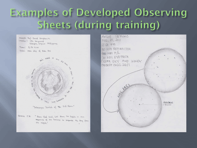 We have people frequently tell us that they cannot draw, therefore, this training would not be possible. We can tell you that this perception is not accurate. With very little skill development, the smallest child to the oldest senior can be taught the basic skills necessary to begin disciplined observing. Here are two examples from the Philippines. Neither student had any previous drawing skills, experience with optics, or knew how to observe the heavens. The observing sheets by each student were done near the end of the course. Already, they were recording good detail, knew the basic parts of an observing sheet, and had begun finding things in the sky. Several classes have shown the same results — people can learn to record what they see.