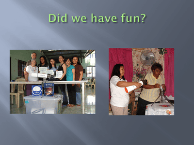 At this point in the presentations we do in person, we conduct a demonstration. Here are couple of pictures to show you what happens. The picture on the left is Linda preparing the contents of a kit for the Institute for Foundational learning. If gives you some idea of the contents of the teaching aids and references that we included. The right picture is a typical outdoor class but also a demonstration. This one was in the Philippines.