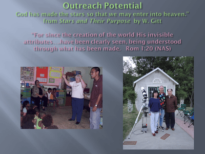 Do not lose sight of the objective, which is to learn to observe God’s created heavens from a Biblical view and in a disciplined manner. Our ministry aim to take this to those who are the neediest or will benefit the most.