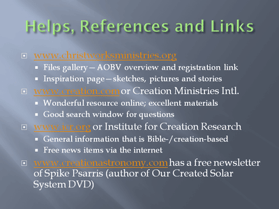 Here are some links that are helpful. Our site is strictly non-commercial and any downloadable material is free. We maintain it to serve others and be an encouragement. Please use it. In addition to the AOBV course, there is an inspiration page with stories of the heavens and parables of the earth that link what we see with things that are encouraging from the Bible or testimony.