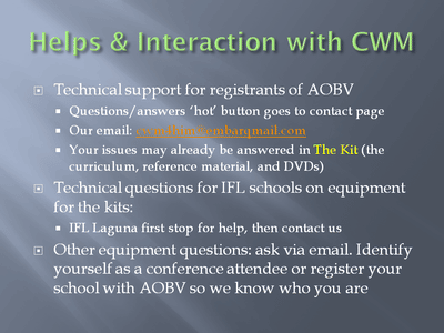 If there are equipment questions, ask them via email also. Identify yourself as a conference or training attendee or register your school or organization with AOBV so we know who you are.