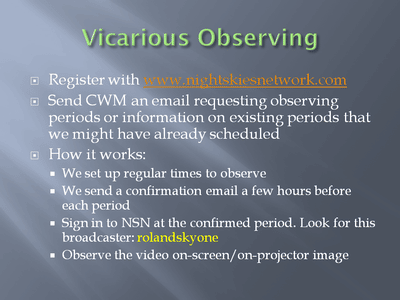 This is what happens during a session with NSN: We set up our equipment in Virginia but substitute an astro video camera in place of an eye piece on a telescope. The composite video of our scene from the telescope is relayed to Night Skies Network, who broadcasts the signal via the WEB.A user can sign in to NSN and find our broadcast name, which is “rolandskyone”.