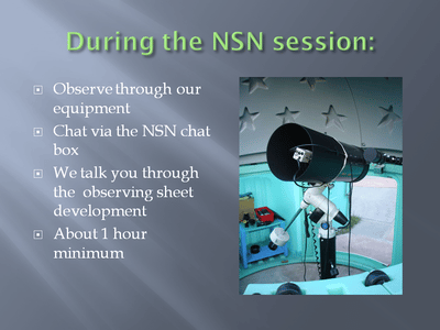 The sessions last from one to 2 hours. We have done this successfully several times. Occasionally there is an equipment failure, but that can be expected in the electronic world. So far the results have been excellent, and it is a wonderful way to observe through equipment that developing regions might not be able to get. A medium grade WEB connection is all that is required. If you can watch basic video on the computer, then you can see NSN broadcasts.As the session progresses, you get views of the object we are studying but also views of the observing sheet that we are developing. You are able to text questions to us in the chat box but also listen to our instructions and you develop your observing sheet and you watch us develop ours. If you have a projector, you can project the computer screen image for a class to see.