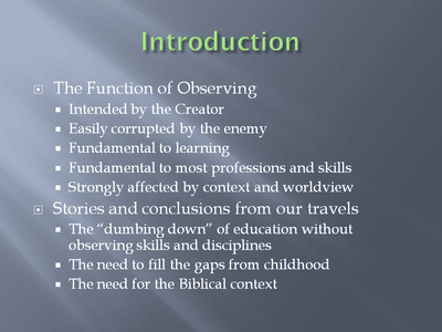 The function of observing is fundamental to learning but also a point of delight. We love to see what is around us. Our senses were designed to appreciate what God has made. Those same senses, observing without a God-centered approach, are easily corrupted. The enemy of our souls has no interest in our making careful observation of God’s creation around us. Yet, observing is central to learning. Most professions and skills require disciplined observing for successful work. However, all observing is heavily affected by the context of our observation and our world view.