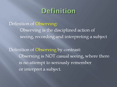Our definition of observing is the disciplined act of seeing, recording, and interpreting a subject. In contrast, casual seeing is not observing, because it does not have the goal of seriously remembering or interpreting a subject. When you think about, the discipline part is essential. Who wants a doctor casually registering symptoms of a serious disease in a patient? Would you hire a contractor to do something in your home who does not pay avid attention to what you want, which you share with him with words and pictures? Disciplined observing is an underlying assumption in most professional skills yet it is not developed, per se, as a discipline in itself. Most education processes assume good observing but do not necessarily teach it.