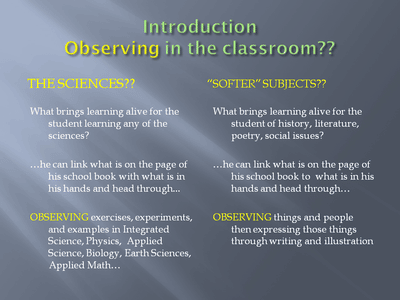 And what school subjects are not positively affected by students who avidly observe in a disciplined manner? Consider this question: what brings a subject alive for a student? Whether the sciences or softer subjects are involved, the student’s excitement about learning is made alive when his head and hands are both involved in observing — not just a textbook but real things that are linked to real life. That is why science teachers consider observing exercises, experiments and working examples are essential to learning. That is why the student is so strongly affected by imagery or pictures or real involvement in a piece of history, literature, or a poem.