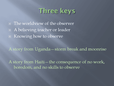In a teacher student relationship, which can exist in many places outside a school classroom, there are three keys for the student to learn observing skills from a Biblical view. The first is the worldview of the teacher. The second is the Christian faith of the teacher. The last is knowing how to observe, which is the “nuts and bolts” of making the observation process a discipline. Here are a quick couple stories show this.