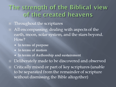 You might ask about the strength of the Biblical view of the heavens. Scriptures on the heavens can be found in over 20 of the 66 books. They are all encompassing as verses state the origins or beginnings of the heavens, their purpose, their general motion, and their Authorship as well as sustainment. They are used in the context of history (as in Genesis), in praise (as in many Psalms), or in relationship to Jesus Christ (like the first verses in Hebrews). In short, God made the heavens (in part) to be discovered and observed because they point to him. The Bible references, which we provide as an addendum in the course we offer, are critically mixed in a variety of contexts so separating them as untrue would essentially demand dismissing the Bible all together.