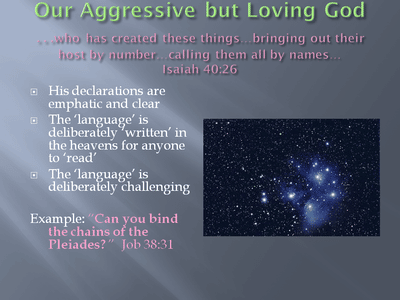 In a very real sense God is aggressive with his display of the heavens. The statement from Isaiah expresses that sentiment, and it is not the only scripture that makes the same declaration. The array of scriptures are clear and emphatic. The language is deliberate and direct. Psalm 19 verses 1 to 4 echoes this sentiment as the verses explain that the language of the heavens is cross cultural and cross historical. In short, it is challenging, because if God did not make the heavens, how can this be? God questions Job directly in the book of Job, which is a recognized historical book but also has literary beauty and quality. As Job 38:31 states: can you bind the chains or move the Pleiades around the heavens where it is supposed to be? It is not an accident that God would use a most beautiful open cluster that can be seen by most of the world’s population with the naked eye to make the rhetorical question have impact. The answer is obvious: we are unable to comprehend the power of God that is able to place sky objects or to give us the rotation rate on a privileged planet so we can observe the celestial sphere and objects as notable as the Pleiades.